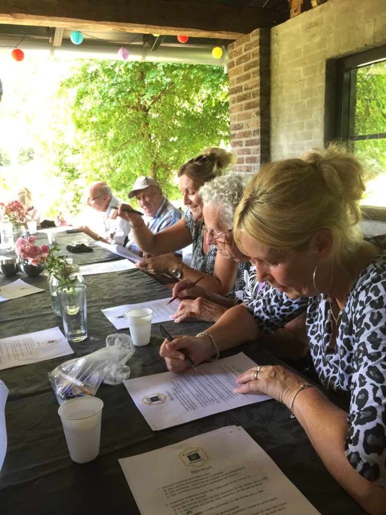 Na de lunch heb ik aan de hand van een quiz iedereen wat verteld over de bijen en het houden ervan. Ook ik moest soms even graven in mijn geheugen… Wim en Maarten bleken de minste fouten te hebben. Hen heb ik verblijd met een potje huisgemaakte courgette in zoetzuur.