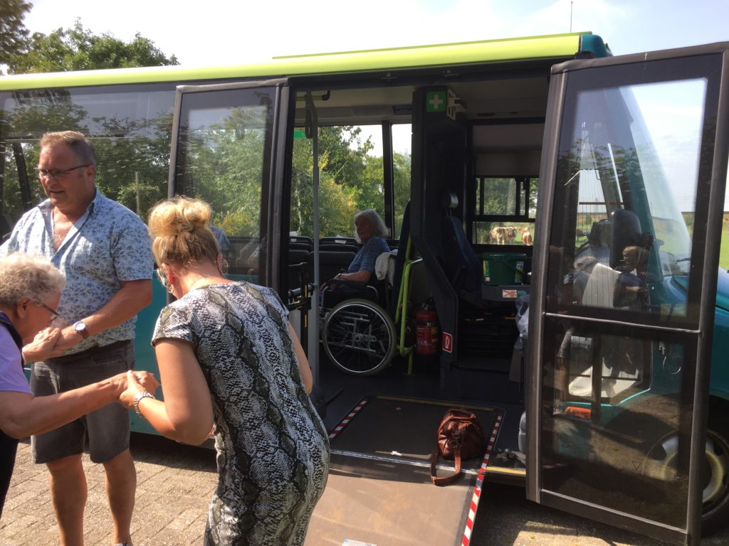 Op woensdag 24 juli werd de Gapershof vereerd met een bezoek van de Vinkenhoeve (facebook) uit Friesland. De Vinkenhoeve verzorgt onder meer de dagbesteding voor ouderen en mensen met een beperking. Mijn zus werkt bij de Vinkenhoeve en zodoende is deze website denk ik een keer ter sprake gekomen. Nadat Nico, de eigenaar van Vinkenhoeve, een kijkje had genomen op de website, leek het hem leuk om eens een bezoekje aan de Gapershof te brengen. Ik vond dat natuurlijk hartstikke leuk. De laatste week van mijn vakantie was een ideaal moment hiervoor. Mijn man moest dan toch werken en zo had ik tijd om alles voor te bereiden. Er zou een groep van circa 18 personen komen. Omdat dat aantal net iets te groot is om in huis te herbergen, was het een voorwaarde dat het mooi weer zou zijn. En dat hebben we geweten. Precies die week kregen we te maken met een hittegolf (temperaturen tegen de 38 graden Celsius). En juist ouderen zijn extra kwetsbaar voor hitte. Veel water / limonade en natte washandjes uit de vriezer waren geen overbodige luxe deze dag. Ook in de bus werd iedereen voorzien van natte washandjes om het hoofd koel te houden. Gelukkig kon iedereen redelijk tegen de hitte en konden we met zijn allen terugkijken op een prachtige en gezellige dag met veel humor.