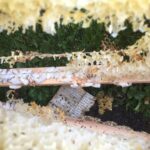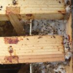 Afgelopen voorjaar bleek dat in een aantal kasten het bijenvolk niet meer leefde. In deze kasten zaten ramen met raat waarin nog een behoorlijke wintervoorraad aan voedsel. Een deel van deze voedselvoorraad is door de bijen uit de kasten met nog een levend volk genuttigd. De kasten zonder volk heb ik op een gegeven moment op de zolder van onze schuur gezet met het idee om ze later een keer goed schoon te boenen met sodawater en om de raten uit de ramen te halen. Dit klusje heb ik (te) lang uitgesteld en de wasmot heeft hier dankbaar gebruik van gemaakt. Vele ramen hadden dan ook nagenoeg geen raat er meer in. De wasmot is voornamelijk te vinden in de voorraad van de imker, bijvoorbeeld bij opslag van ramen, maar ook wanneer een volk sterft, en de imker dit niet tijdig door heeft, heeft de wasmot vrij spel. Gevolg, een grote chaos en heel veel larven. In principe vreten de larven van de wasmot de was, de honing en het stuifmeel in de ramen aan, maar bij mij hadden de larven zich ook al in het hout van de kasten ingevreten. Op zich maken ze wel een mooi reliëf in het hout.